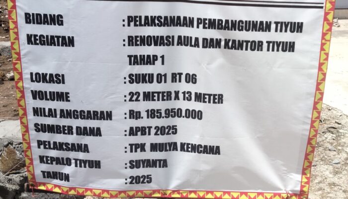 Untuk meningkatkan proses pelayanan kepada masyarakat yang lebih baik dan lebih nyaman, Pemerintah Tiyuh Mulya kencana, Kecamatan Tulang bawang Tengah, Kabupaten Tulang Bawang Barat (Tubaba) lakukan renovasi aula dan Kantor Tiyuh (balai Tiyuh) Tahap 1 dengan memanfaatkan Dana Desa (DD) tahun 2025 senilai Rp185.950.000